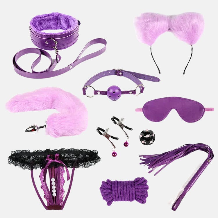 - Package Includes: Headwear, Eyepatch, Ball Gag, Collar with Pulling Belt, Whip, Nipple Clamps, G-string, Cotton Rope, Fox Tail, Small Toy