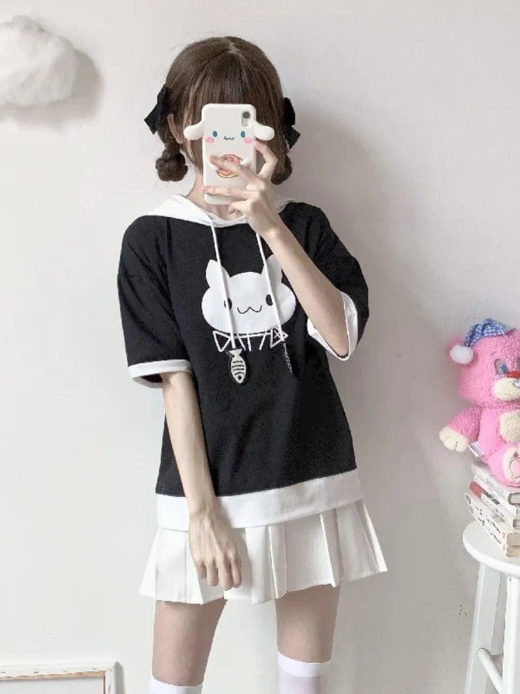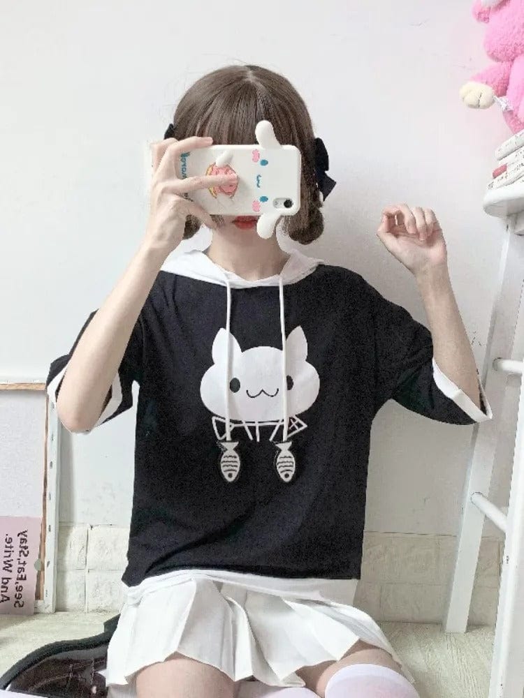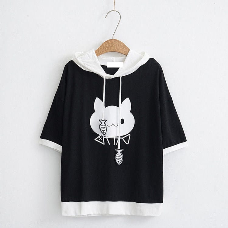 - Package Included: Cartoon Kitty Cat Fish Drawstring Hooded T-Shirt