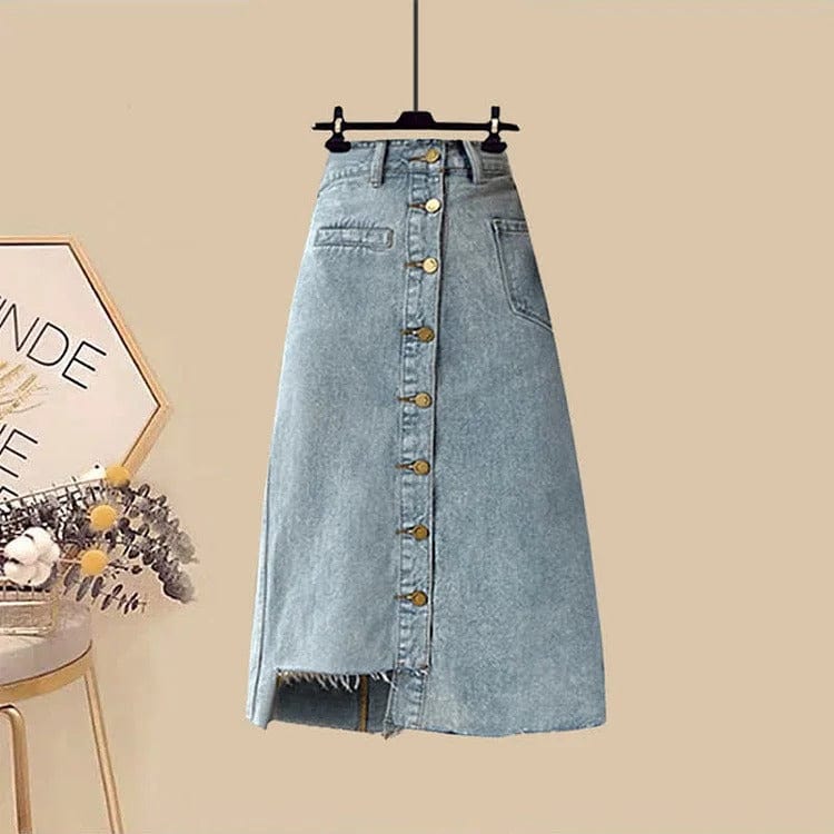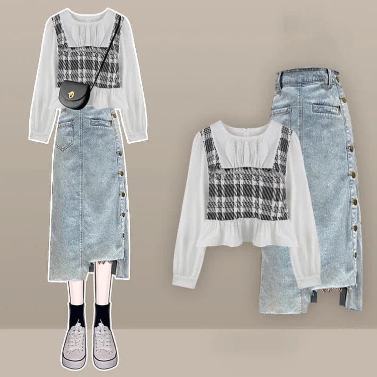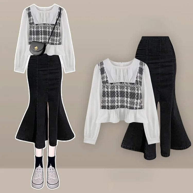 Plaid Lattice Print Shirt Fishtail Denim Skirt Two Piece Set