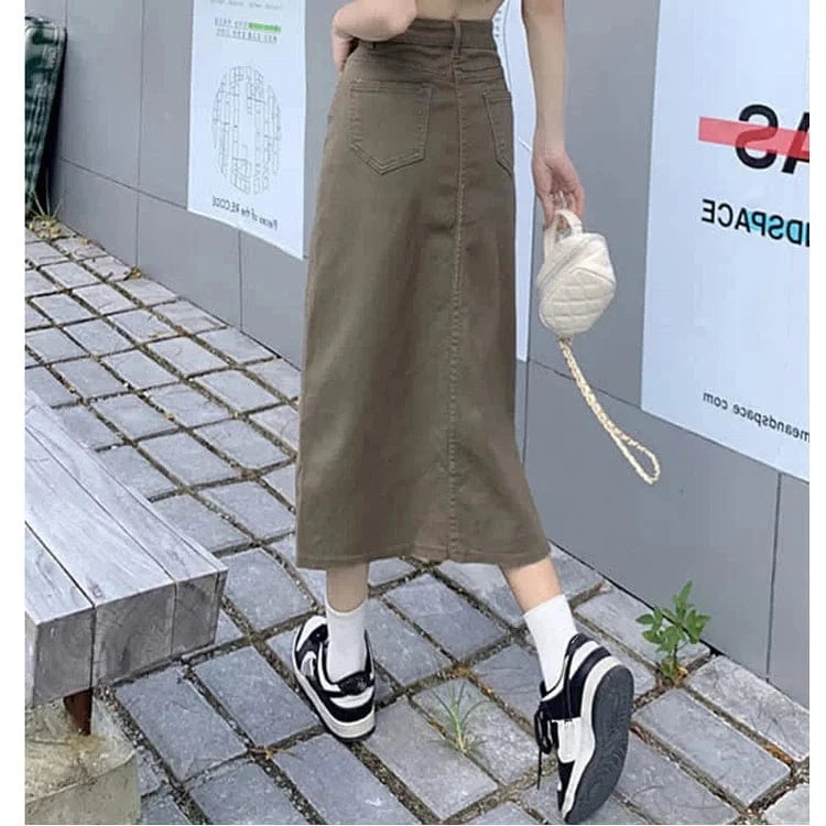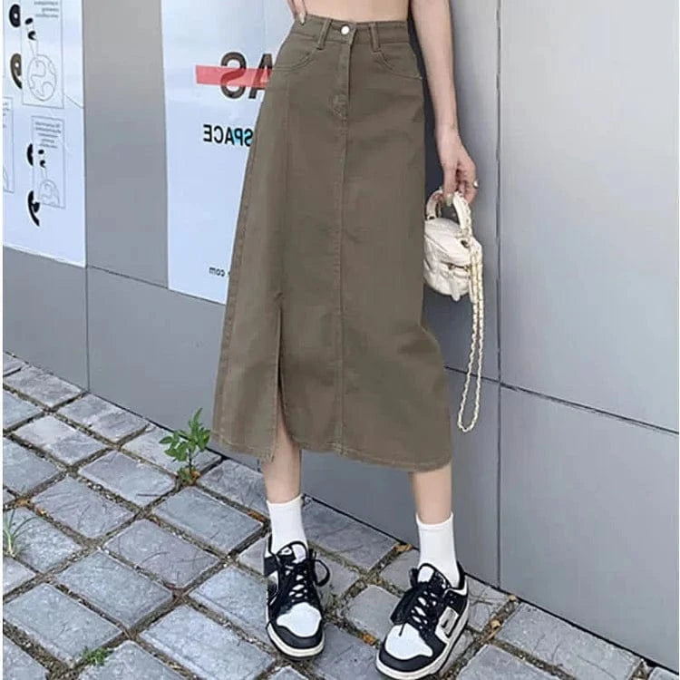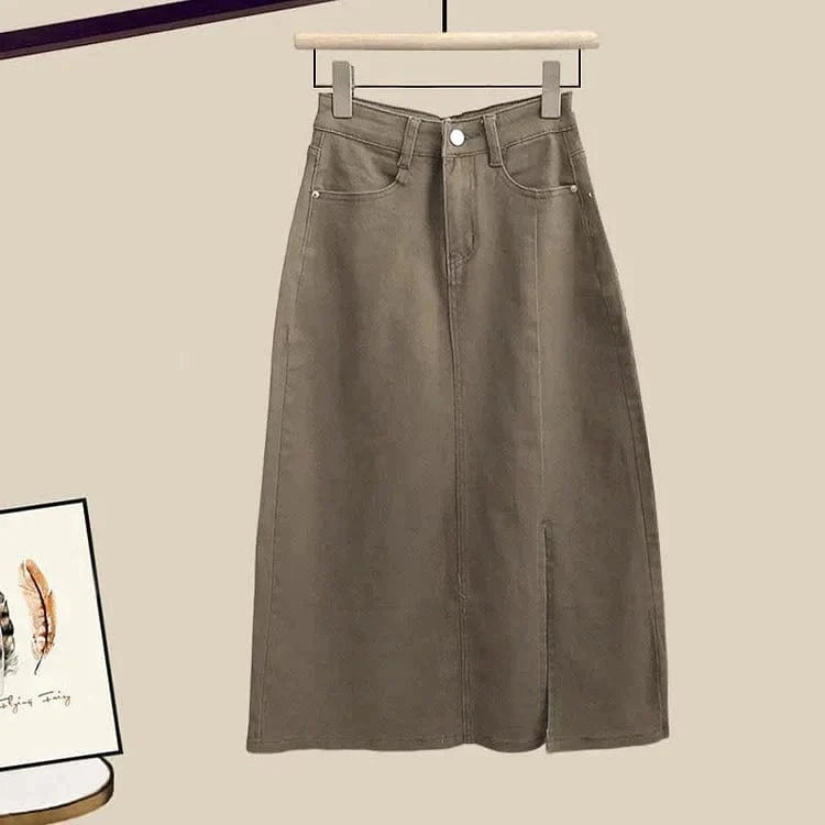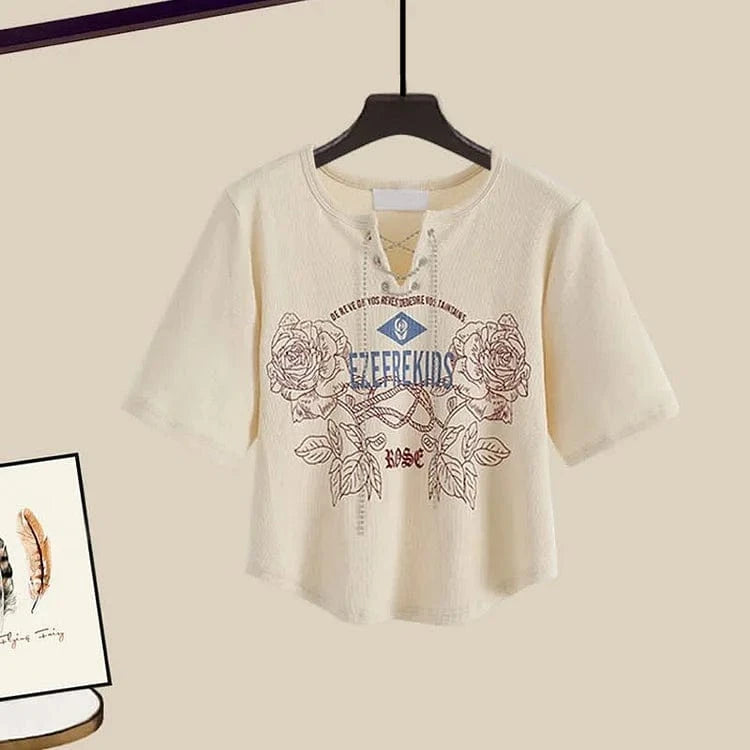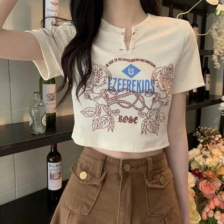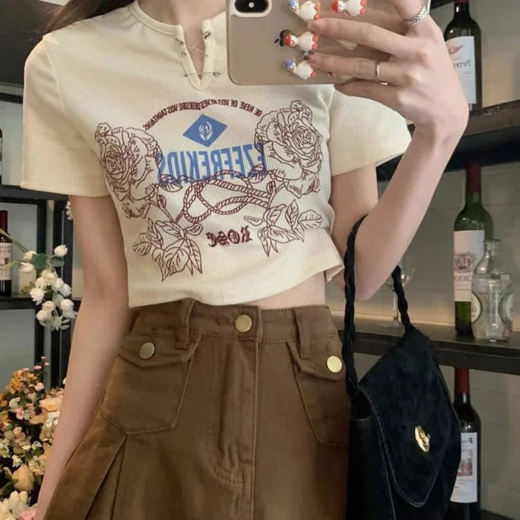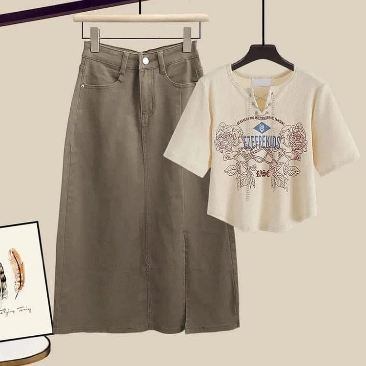 Retro Rose Letter Print Crop Top T-Shirt Split Denim Skirt