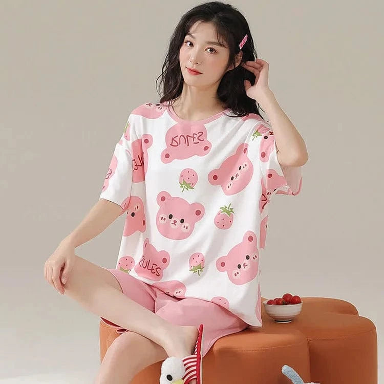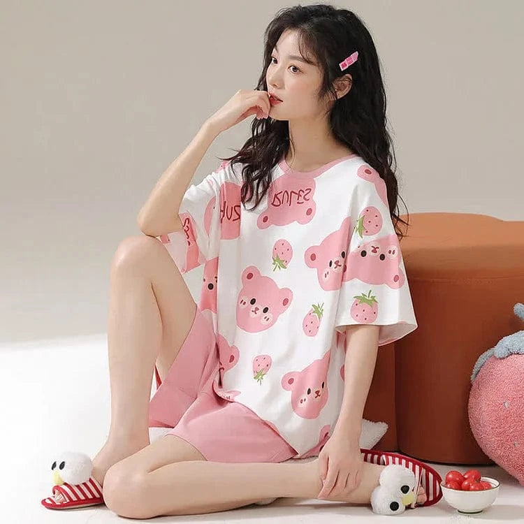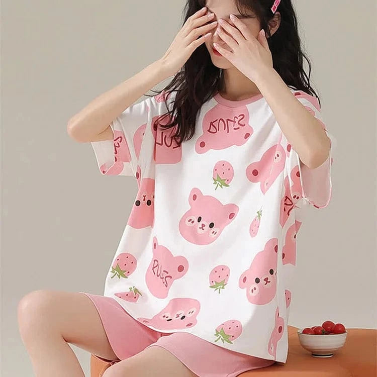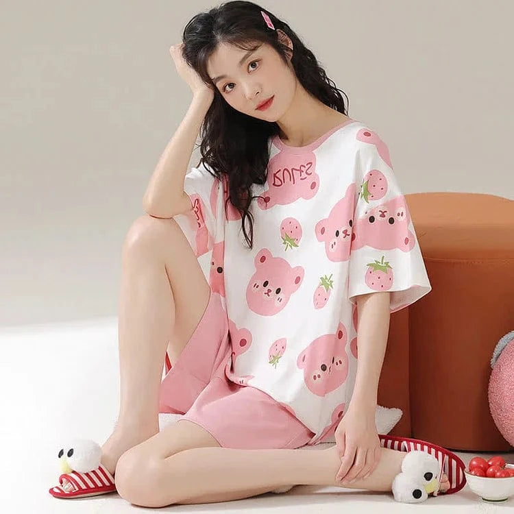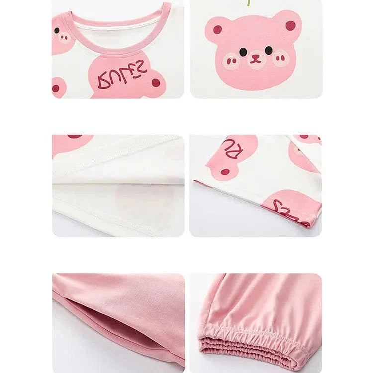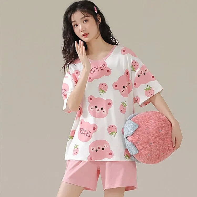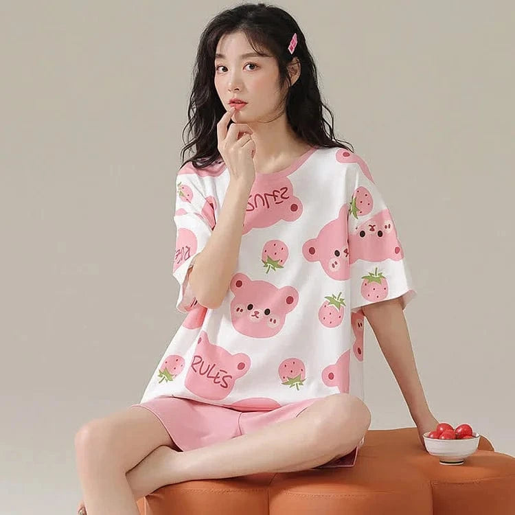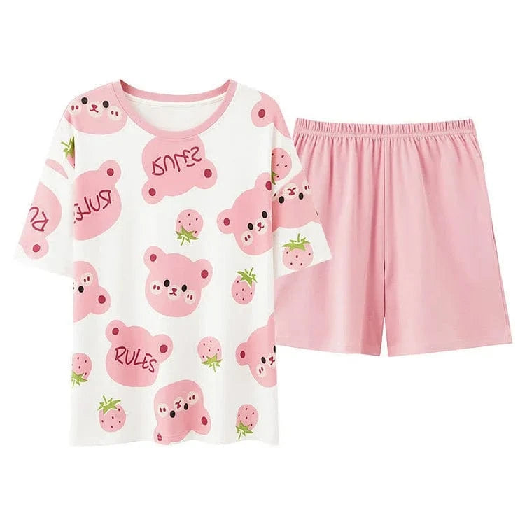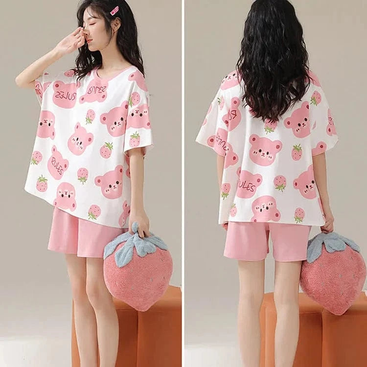 Cartoon Bear Strawberry Letter Print Summer Cotton Pajamas Set