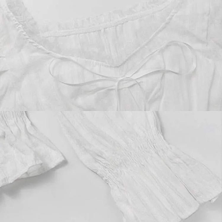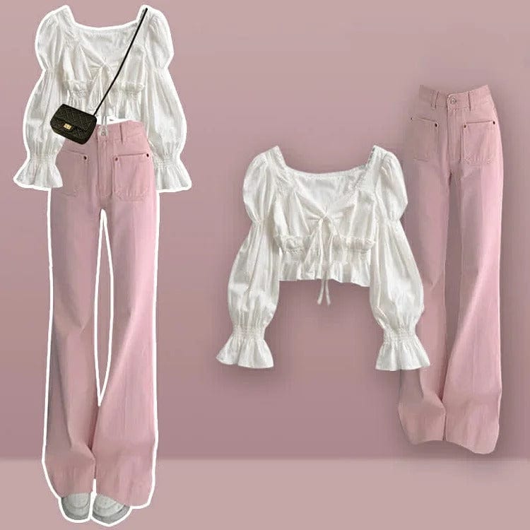 Chic Puff Sleeve Shirt Flared Denim Pants Two Piece Set