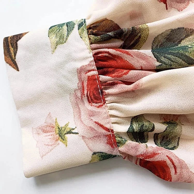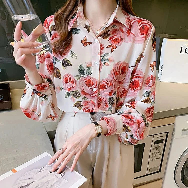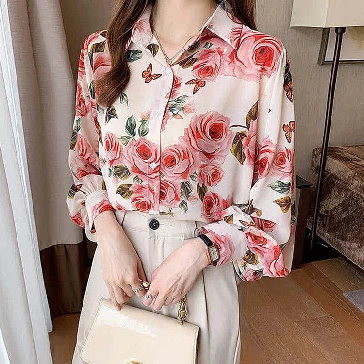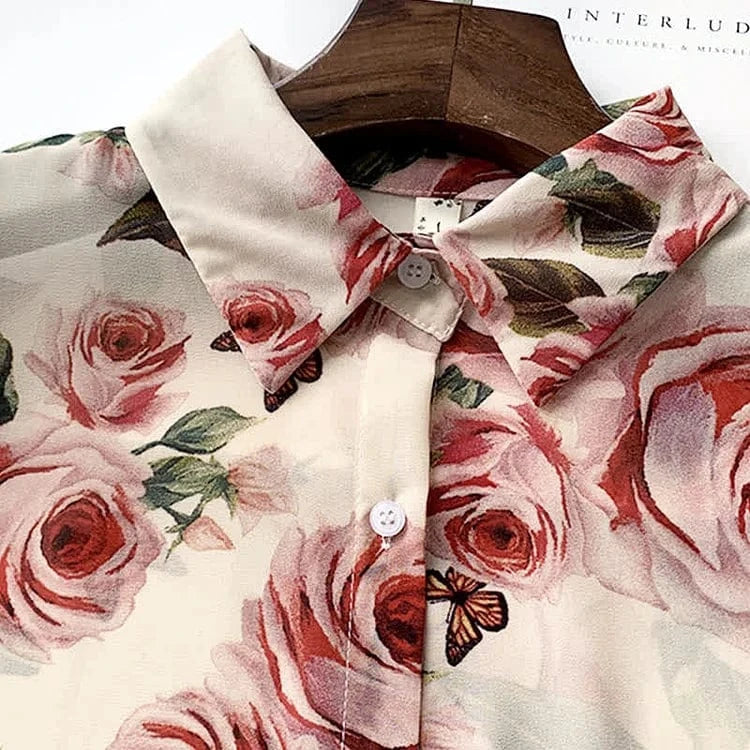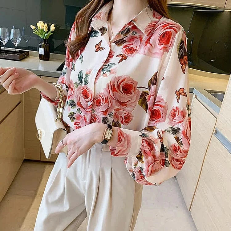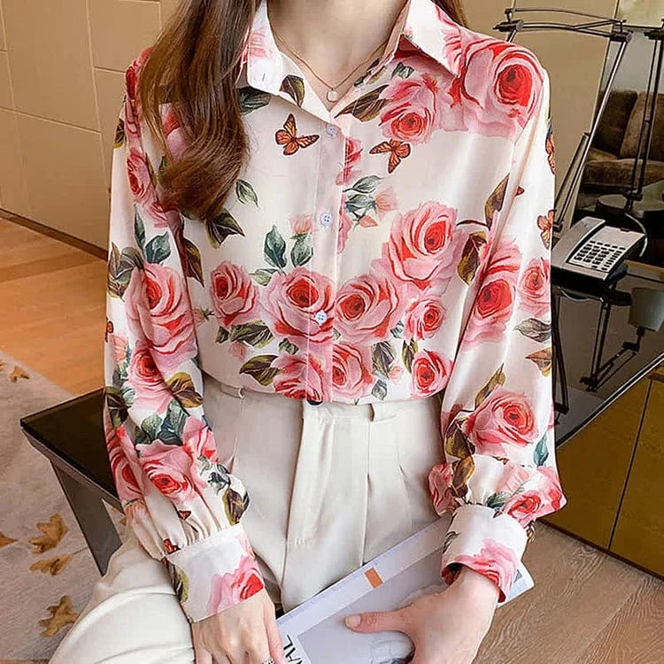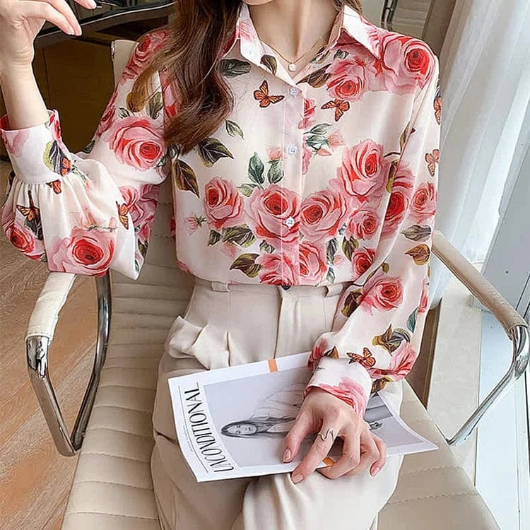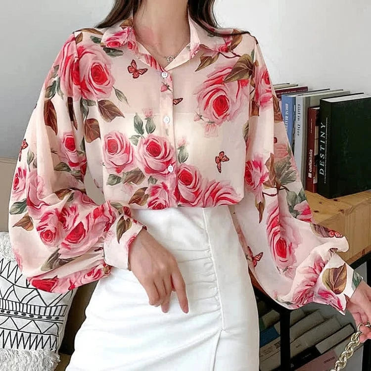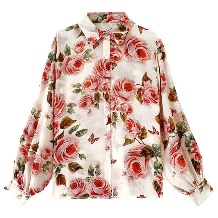Rose Floral Print Puff Sleeve Chiffon Button Shirt Workwear